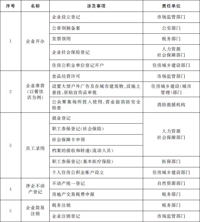(一)推进企业全生命周期相关政务服务事项“一件事一次办”。围绕企业从开办到注销全生命周期的重要阶段,梳理集成同一阶段内需要到政府部门、公用企事业单位和服务机构办理的多个单一政务服务事项,为企业提供开办、工程建设、生产经营、惠企政策兑现、员工录用、不动产登记、注销等集成化办理服务,提高办事效率,降低办事成本。