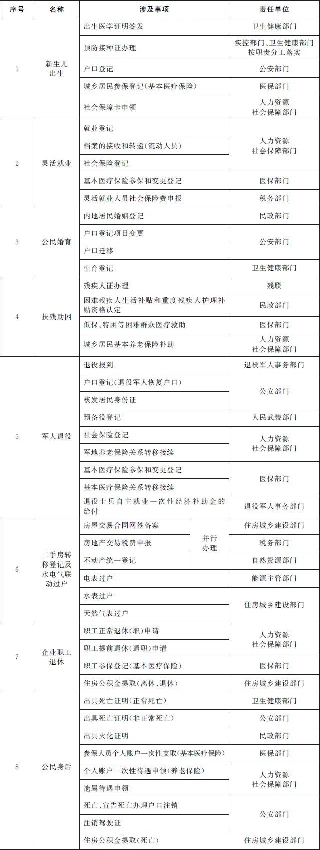 (二)推进个人全生命周期相关政务服务事项“一件事一次办”。围绕个人从出生到身后全生命周期的重要阶段,梳理集成同一阶段内需要办理的多个单一政务服务事项,为群众提供新生儿出生、入园入学、大中专学生毕业、就业、就医、婚育、扶残助困、军人退役、二手房交易及水电气联动过户、退休、身后等集成化办理服务,切实提升群众办事便捷度,减少跑动次数。
