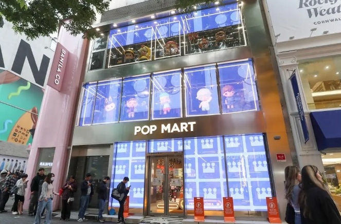 2025年5月20日,顾客在韩国首尔明洞街区的泡泡玛特店面前排队。