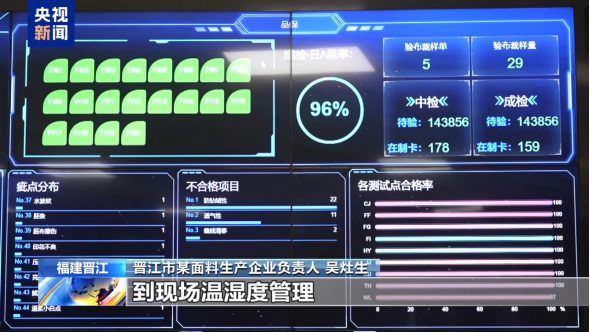 晋江市某面料生产企业负责人 吴灶生:我们的中控系统已经覆盖了从化验室自动测量,到现场温湿度管理,酸碱度管理等多个环节。还可以对接供应商平台,和我们的集中管理系统联动,实现对所有机台运行状态的实时可视监控。